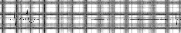 The above is an example of a a 6.3 second asystole, in this case caused by sinus arrest with no backup pacemakers taking over. The first beat is normal, the second beat is a PVC, then there is 6.3 seconds of no electrical activity in the heart, followed by a relatively normal looking beat at the far right side of the strip (although technically it is a junctional escape beat, e.g. the impulse originated in the AV junction, not the SA node). Although the above example shows no electrical activity during the 6.3 second asystole, you may also have a similar asystole where there are P waves throughout the asystole but no QRS complex as a result of complete AV block with a failure of the backup pacemeker (all cells in the heart can act as backup pacemakers to the SA node). The result for the patient is the same; severe lightheadedness, dizziness, near sycnope or a syncopal or passing out epsiode. Depending on the cause, medications or a permanent pacemaker is indicated.